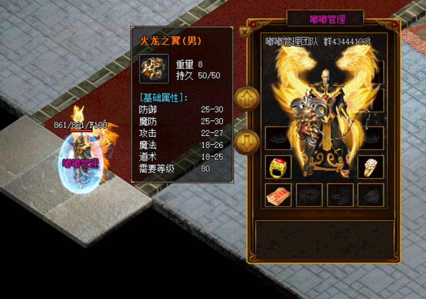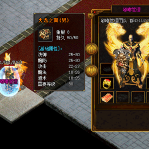 装备名:火龙之翼(男) 重量:8 持久:50 物理防御:25-30 魔法防御:25-30 攻击:22-27 魔法:18-26 道术:18-25 需要等级:80 爆出怪物:火龙地图BOSS 龙王地图BOSS 灵蛇岛 华山论剑 钟南山 狐狸峡谷 千年古寺 龙炎洞穴的BOSS |